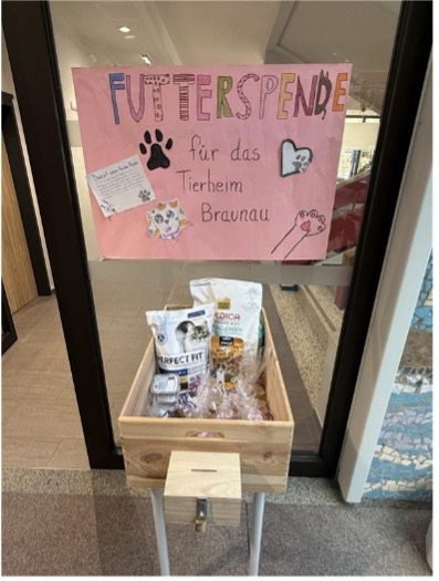Wir sind Linda, Lisa, Zeinab und Hermann aus der 2c und sammeln Geld und Futterspenden fürs Tierheim, um Tieren zu helfen und zu zeigen, wie wichtig Zusammenhalt und Tierliebe sind. Wir haben unser Projekt mit dem Tierheim Braunau organisiert und dafür Spendenboxen gebaut, mit welchen wir Futter- und Geldspenden sammelten. Dank der Spenden bekommen die Tiere Futter, Pflege und alles, was sie zum Wohlfühlen brauchen.